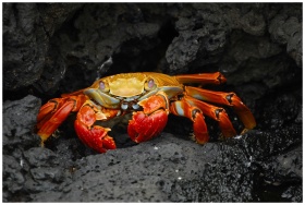 A vivid red rock crab nestled in dark volcanic rocks showcases striking natural contrast.