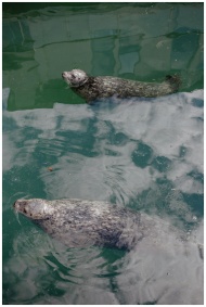 Two adorable harbor seals swimming peacefully in clear water at the zoo.