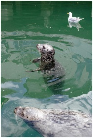 Close-up of playful harbor seals swimming alongside a curious seagull in vibrant water.