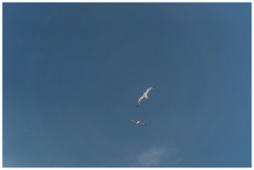 Two seagulls gracefully flying under a clear blue