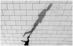 Black and white photo of a shadow on tiled pavement in Mar del Plata, Argentina.