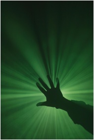 A mysterious silhouette of a hand reaching toward vibrant green light rays creating a dynamic visual effect.