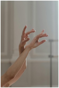 Close-up of a ballet dancer's hands captured in an elegant, graceful position, evoking movement and artistry.