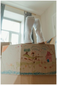 Child's feet in socks peeking out of a decorated cardboard box, indoors.