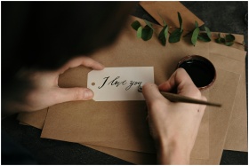 Person crafting a beautiful 'I love you' card with calligraphy, featuring eucalyptus and ink.