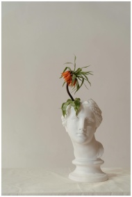 Artistic sculpture of a head bust with a vibrant floral bloom on a neutral background.