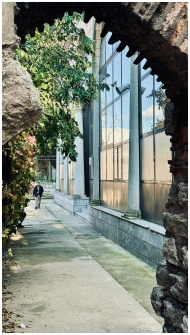 A scenic view of an arched pathway in Istanbul with ancient architecture and lush greenery.