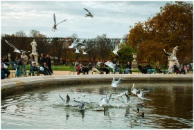 Seagulls fly over a pond in a bustling park, surrounded by seated visitors enjoying the serene setting.
