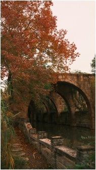Historic stone arch bridge with autumn foliage over a tranquil river, capturing nature's beauty.