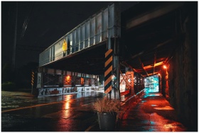 Dimly lit urban underpass at night with rain-soaked reflections and vibrant lighting.
