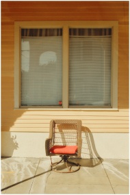 A wicker chair with a red cushion on a sunny New Orleans porch casting long shadows.
