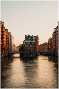 Scenic view of Speicherstadt district in Hamburg with historic architecture and calm water at sunset.