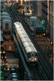Captivating view of a train navigating through the elevated tracks in a bustling urban setting.