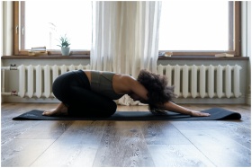 Woman practicing yoga at home on a mat in a cozy r