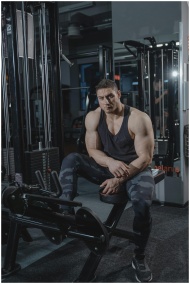 A muscular man in workout attire sitting on gym eq