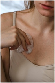 Close-up of woman using a gua sha tool on her ches