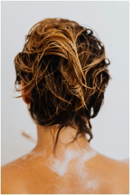 Close-up of wet blonde hair viewed from behind, capturing a moment of showering and wellness.