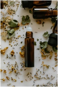 A flat lay of essential oil bottles surrounded by