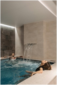 A couple enjoying a relaxing moment in a modern indoor pool.