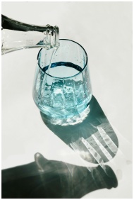 Closeup of water being poured into a glass, with artistic shadow play on a sunny day.
