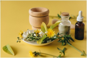 A collection of herbal remedies and natural ingredients on a yellow background, symbolizing holistic health.