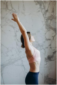 Side view of a woman doing a yoga stretch in an in