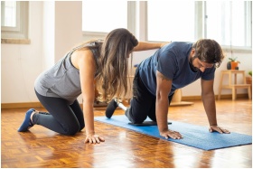A man with a prosthetic leg exercises with a trainer indoors for adaptive fitness.