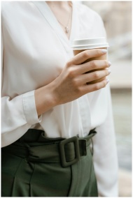 Close-up of a woman holding a coffee cup, dressed