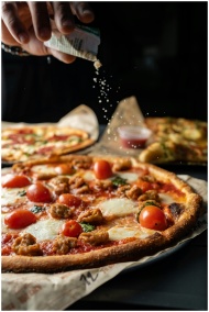 Close-up of a freshly baked pizza with cherry tomatoes, mozzarella, and herbs being sprinkled by hand.