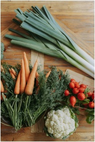A variety of fresh vegetables including carrots, leeks, radishes, and cauliflower on a wooden surface.