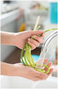 Close-up of hands washing green vegetables under a kitchen faucet for cleanliness.