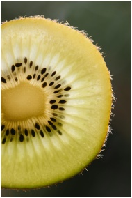 Closeup of fresh ripe cut piece of green fruit of kiwi on blurred background