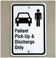 Sign indicating patient pick-up and discharge area at a healthcare facility.