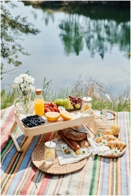 Relaxing outdoor picnic setup with fresh fruits and bread by a serene lake.