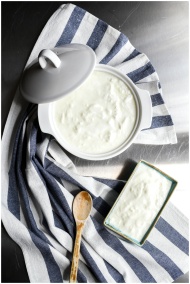 Top view of homemade yogurt in a ceramic pot, styled with a wooden spoon and striped cloth.