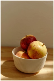 Close-up of red apples in a ceramic bowl on a wooden surface, capturing warm morning light.
