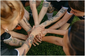 Tattooed team members join hands in a circle signifying unity and teamwork on a grassy field.