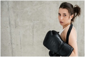 A determined woman with boxing gloves poses agains