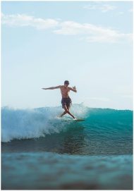 Surfer rides a powerful wave under the blue sky in