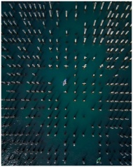 Kayakers navigate through a pattern of wooden pylons in clear water from an aerial perspective.