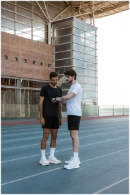 Two male athletes in sportswear discussing a workout strategy on a running track outdoors.