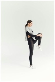 Woman in modern sportswear stretching indoors, sho