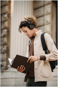A young adult wearing headphones studies from a folder outside a stone building.