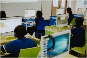 Children engaged in learning at computers in a mod