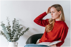 A young woman in a red sweater sits indoors, pondering over a book with eucalyptus plant nearby.