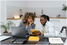 Two individuals engaged in a meeting, using laptops and tablets, in a modern office setting.