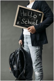A student in casual attire holds a small chalkboard with 'Hello School' written, signaling a school theme.