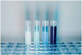 Close-up of test tubes filled with colorful liquids in a laboratory setting.