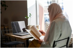 A woman in a hijab sits indoors by a window, reading a book next to a laptop on the table.