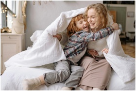 A mother and daughter share a joyful moment, wrapped in a cozy blanket at home.